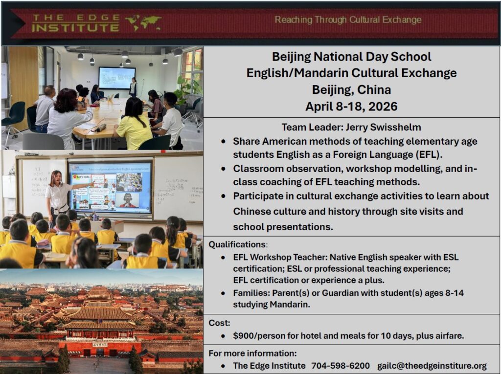 Project Task: Volunteers will participate in cultural exchange activities to learn about Chinese culture and history through site visits and school presentations. Volunteers will also have opportunities to observe English classes in a Chinese school and to discuss and model American methods of teaching English as a foreign language.